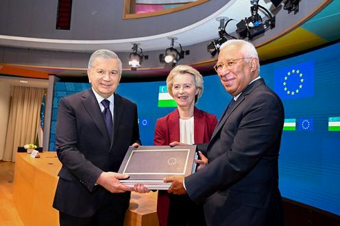 乌兹别克斯坦与欧盟缔结了新版《增强伙伴关系与合作协定》。签署仪式于10月24日在布鲁塞尔举行,中亚共和国领导人沙夫卡特·米尔济约耶夫、欧洲理事会主席安东尼奥·科斯塔与欧盟委员会主席乌尔苏拉·冯德莱恩共同出席。